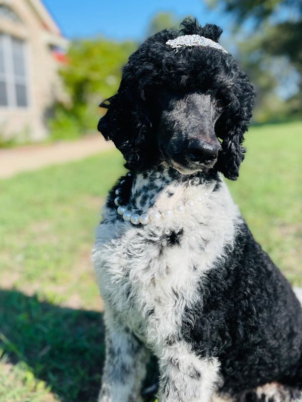 Momma Margaux is a 2-year-old, AKC Standard Poodle. She is a smaller standard, standing at 22" tall, and weighing in at 40 lbs. She is a tri parti with a clean bill of health and excellent blood line. She has whelped one litter of puppies.